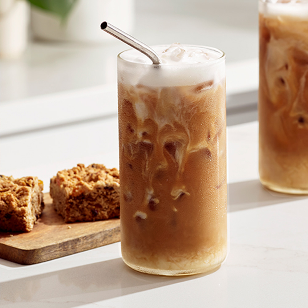 ۳۰۰ میلی لیتر، یک شات اسپرسو ۸۰% عربیکا و ۲۰% روبوستا، فوم شیر، یخ